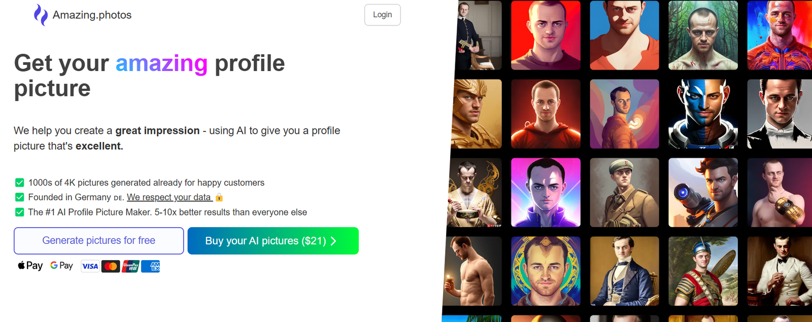 Amazing Photos is a leading AI-powered profile picture generator designed to help you create a lasting impression. With thousands of 4K pictures generated for happy customers, Amazing Photos stands out for its exceptional quality and reliability. Founded in Germany, Amazing Photos prioritizes data privacy and security, ensuring that your personal information is well-protected. The platform leverages advanced AI technology to produce profile pictures that are 5-10 times better than other solutions available on the market.