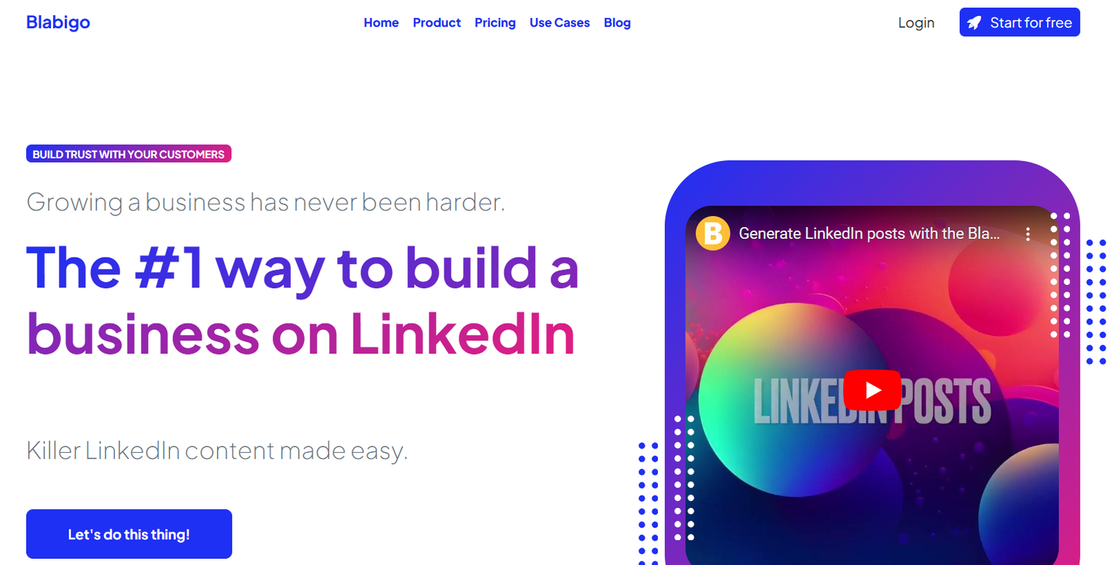 Growing a business has never been harder. Leverage the power of AI for LinkedIn growth with Blabigo. This platform makes creating killer LinkedIn content easy, helping you enhance your business presence and attract more followers. Blabigo provides tools to streamline your LinkedIn content strategy and boost engagement.