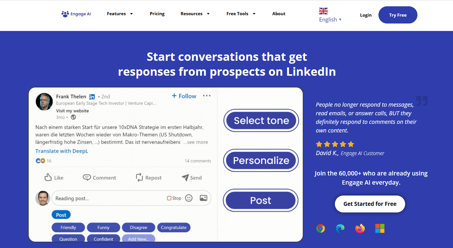 Engage AI is a powerful tool designed to boost engagement on LinkedIn by generating intelligent and relevant comments. Using advanced AI technology, Engage AI analyzes posts and generates comments that are contextually appropriate and engaging. This tool is ideal for professionals, social media managers, and marketers looking to increase their interaction on LinkedIn without spending excessive time on manual commenting. By automating the comment generation process, Engage AI helps maintain an active presence and fosters meaningful connections.