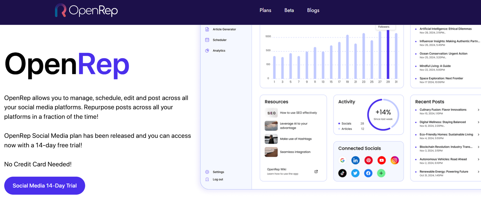 OpenRep is a comprehensive social media management tool that allows you to schedule, edit, and post content across all your social media platforms. With OpenRep, you can repurpose posts quickly, saving time and maintaining a consistent online presence. Try it free for 14 days without needing a credit card.