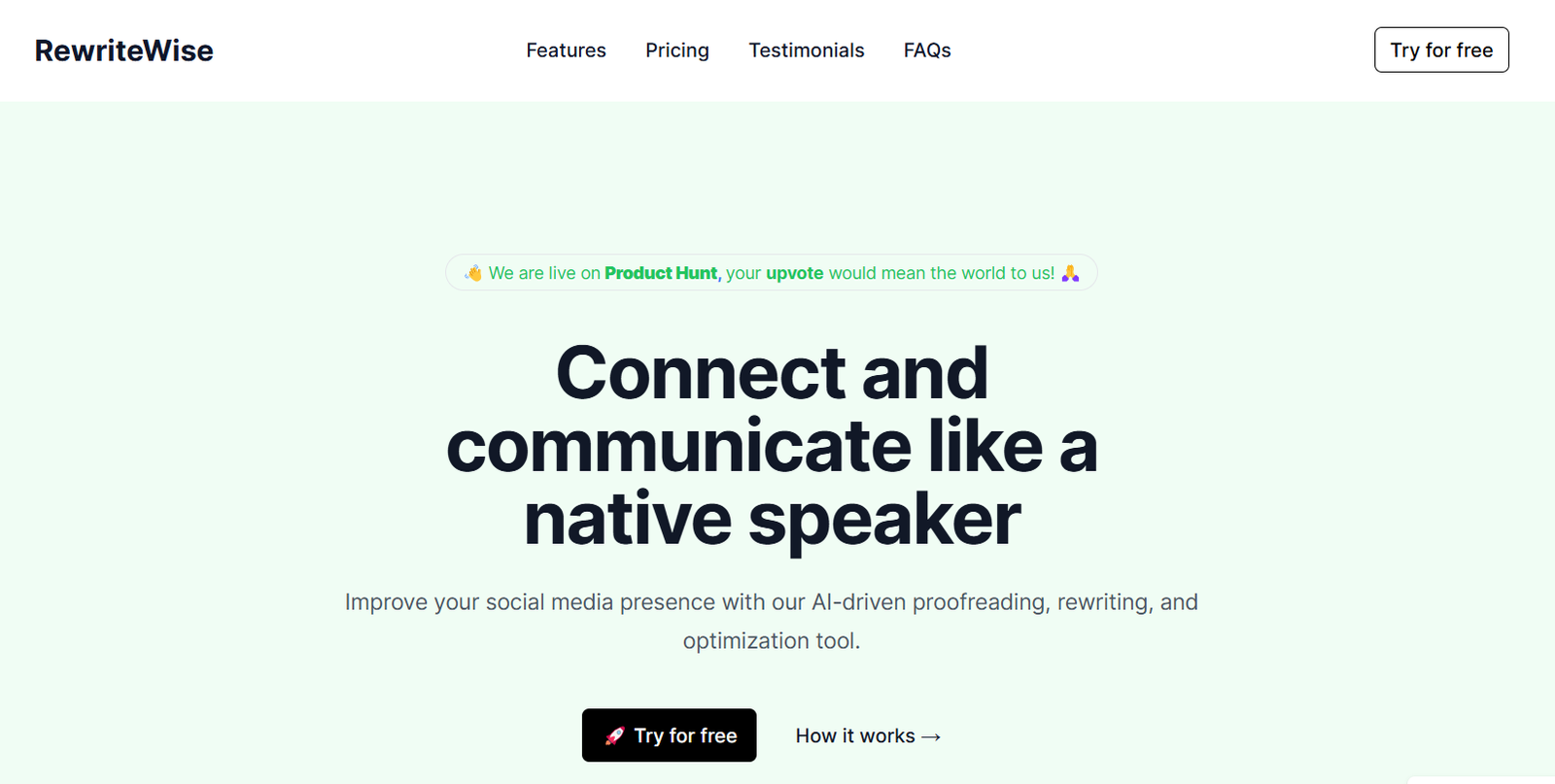 RewriteWise is an AI-driven tool designed to enhance your social media presence through advanced proofreading, rewriting, and optimization. The platform helps ensure your content communicates effectively and professionally, making it easier to connect with your audience. By providing native-like text adjustments, RewriteWise improves readability and engagement across your social media channels.