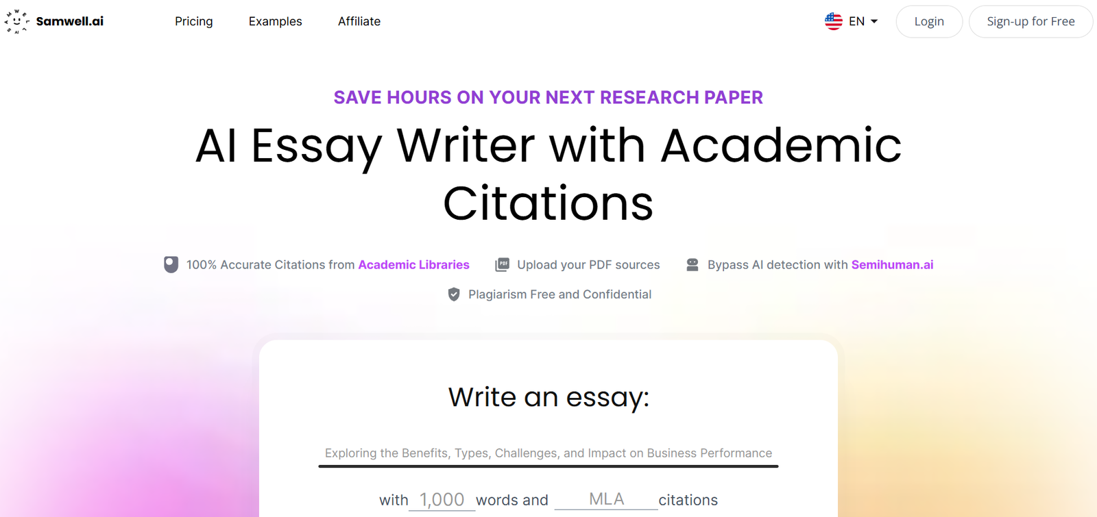 Samwell AI is an AI essay writer designed to save you hours on your next research paper. This tool provides 100% accurate citations from academic libraries and allows you to upload PDF sources. With Samwell AI, you can bypass AI detection using Semihuman.ai, ensuring your work is plagiarism-free and confidential.